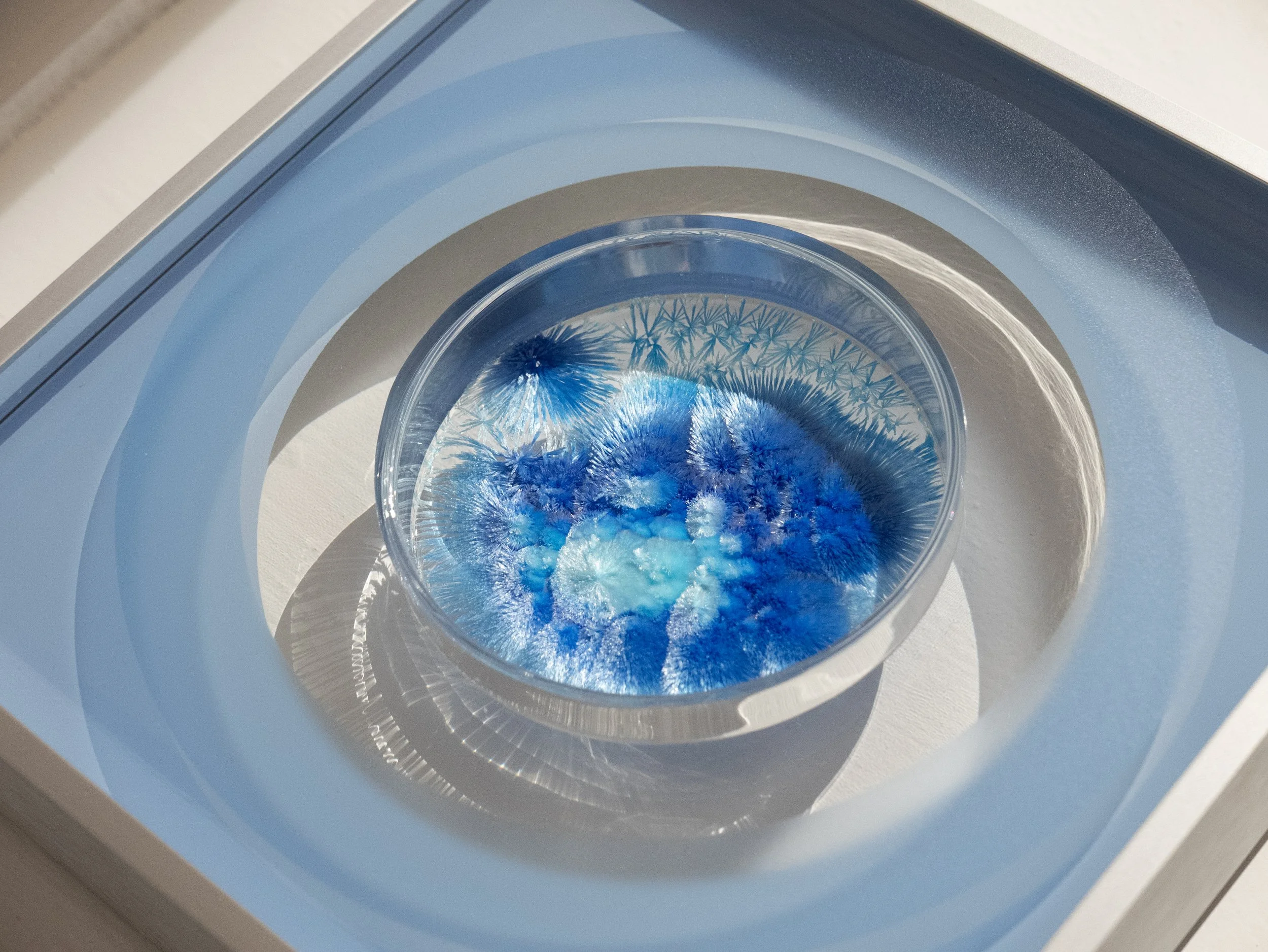 Crystal Garden: Seasons is an artist–nature co-authored crystallization art (Sci-Art) series. Guided by the principles of crystal growth, the work sets boundaries and conditions while allowing crystals to develop freely within them. By distilling seasonal imagery into an artistic language, it suspends nature’s ever-renewing transformations in petri dishes—crystals layering like branches and leaves, blooming like clustered flowers. Dense crystalline formations conjure seasonal landscapes.